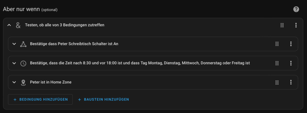 These IF conditions include that it should only fire when the smart switch, with which I switch my entire desk setup (monitors, chargers etc.) on or off, is switched on – meaning I am working. Then it should only trigger during workdays from 8:30 in the morning until 18:00 in the evening. And lastly it is only allowed to run if I am actually at home. This trigger uses the Home Assistant app on my phone to get a geolocation.