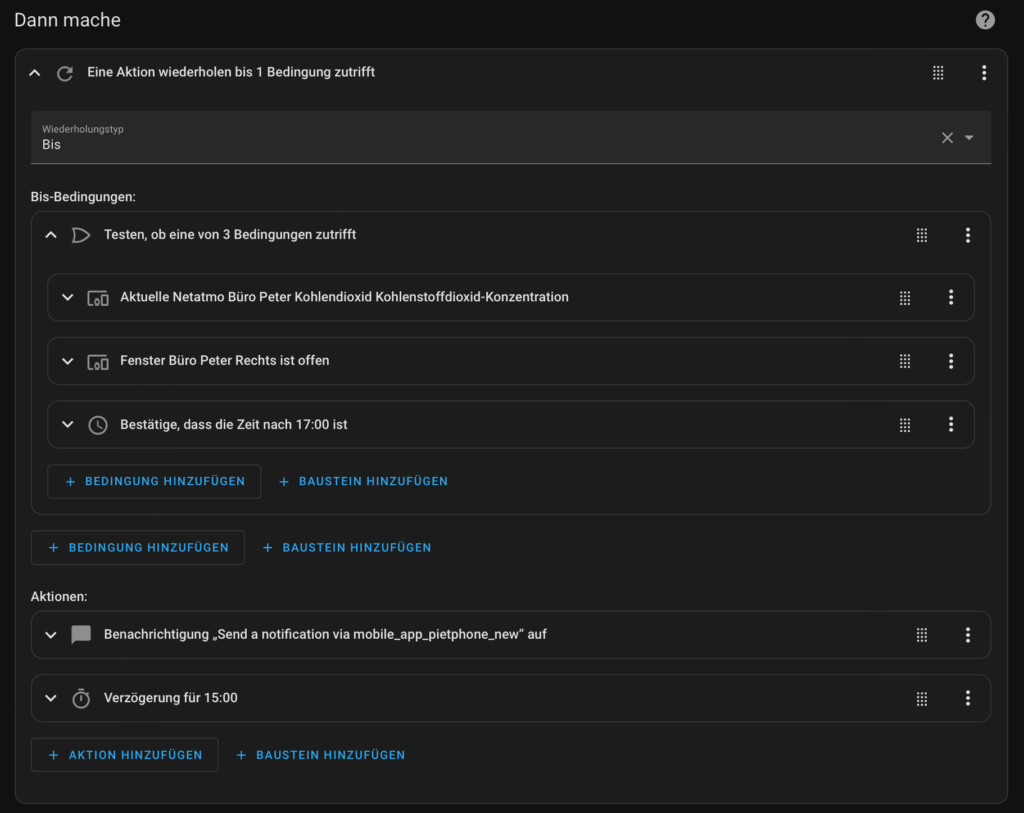 This “THEN” part shows that I do not only send out one notification. This would not work as I might miss it during a call or meeting. It contains a loop that continuously runs, sends out the notification to my phone every 15 minutes. The conditions that break the loop are, if the CO2 levels drop below 1250 ppm, the right window of my office is being opened or if the time is after 17:00. This ensures that I do not get these sort of notifications anymore after work or if I already let air in but still keeps me reminding to do so, until this happens.