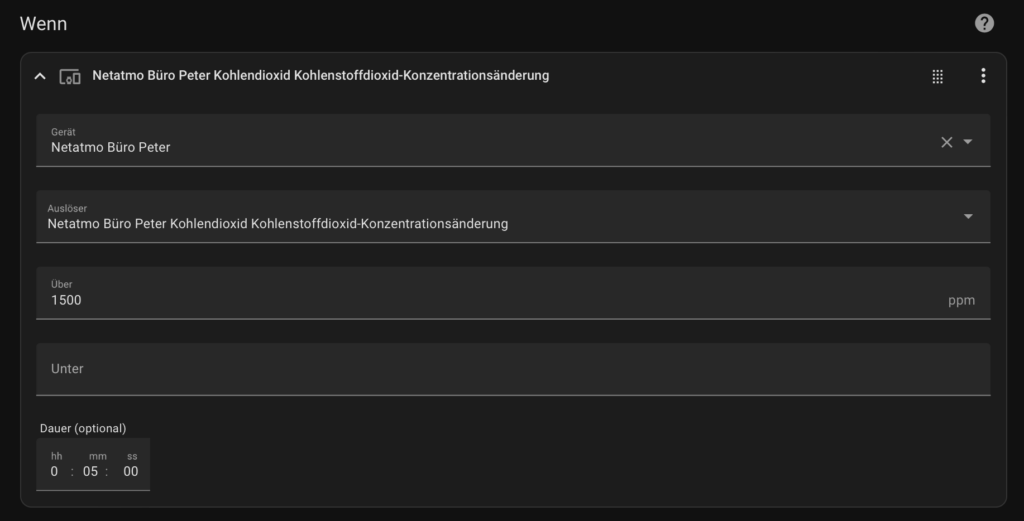 I created an automation in Home Assistant that starts if the CO2 levels in my office rise above 1500 parts per million which, according to many sources, can be considered a bad air quality. I added that these levels have to remain that high for 5 minutes to counter the possibility that I have already left the room or opened the window before this fires.
