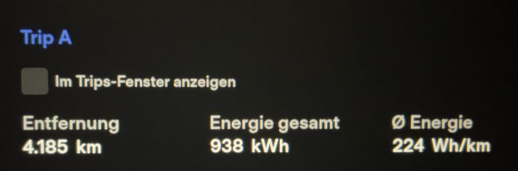 Secondly, there is the cost. Currently, one liter of petrol or diesel here costs somewhere around 1.8€ (which is at a multi-year low). One kilowatt of electricity is 40ct (at home and at slower chargers and a multi-year high). So, I paid 375€ for those 938kWh of Electricity to get me the 4.185km distance. The same amount of money would have gotten me 208 liters of petrol or diesel. This would have gotten me (besides emitting close to 500kg of CO2) the 4.185km, if my car constantly would have used less than 5 liters of petrol on 100km. Something that can only be achieved with much smaller cars with much less power. Also, keep in mind that it was not long ago when the fuel price was over 2€ per liter – and there the story is totally different.