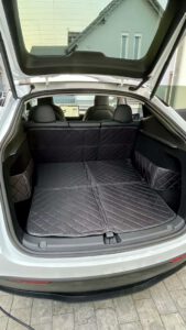 Space is something the Tesla Model Y has for sure. Other than the slightly smaller Model 3, the trunk opens with a wide door fully open and you can use the entire space. Tesla claims that it has 1900 liters of space if you fold down the seats. The German ADAC measured 420 Liters with seats up and 1380 liters with folded down seats (for comparison, a Mercedes E-class T-model has between 640 bis 1820 liters). However, these values are misleading when it comes to total space – and this is also where the discrepancy comes from. The Tesla has huge amounts of space under the trunk and on the sides. You can easily store another cabin bag and more in there. Then there is the frunk in which you can also store items (I mainly use it for the charging cables, 230V charger, first aid kit, and so on, so you don’t have them flying around and you still can access all of that even if your entire trunk is filled to the roof). So, the 1900 liters, Tesla claims it has, can absolutely make sense – just not if you “only” measure the trunk above the floor.